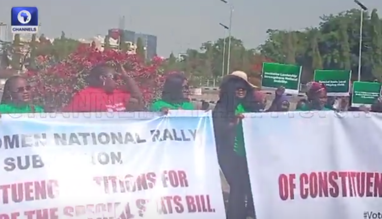 A large group of women on Wednesday gathered at the entrance of the National Assembly, calling on lawmakers to support a bill that seeks to create special seats for women in both state and national legislatures.