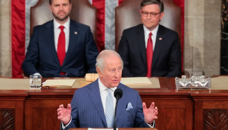 King Charles III addresses a joint meeting of Congress as Vice President JD Vance and House Speaker Mike Johnson look on.