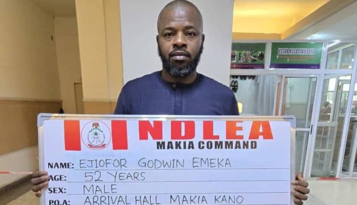 Operatives of the National Drug Law Enforcement Agency (NDLEA) have arrested a 52-year-old businessman, Ejiofor Godwin Emeka, at the Mallam Aminu Kano International Airport (MAKIA), Kano, after he excreted 127 wraps of cocaine concealed in his stomach and private parts.